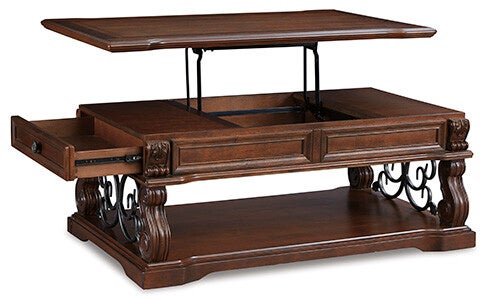 Rich wood and rustic metal work so well together in this lift top coffee table. We love how the curvaceous shape of the table’s serpentine legs is echoed in the scrolled metal accents—for a modern-classic style that’s substantial without being heavy. This lift top table is ideal for informal dinners in front of the television, adding function to great form. A fixed shelf provides display space for your favorite whatnots while drawers keep essentials out of sight.