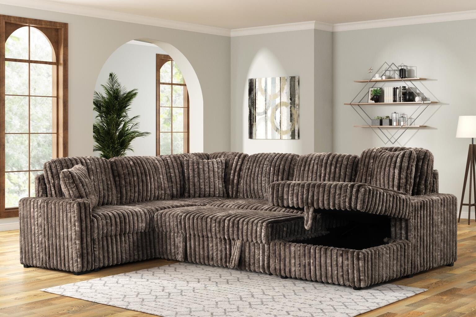 Wrapped in plush corduroy fabric with a rich brown finish, this spacious sectional brings warmth and comfort to any room. The pull-out bed easily transforms your space for overnight guests, while the lift-in storage compartment keeps blankets, pillows, and essentials neatly tucked away. Complete with matching throw pillows, this sectional blends cozy style and multifunctional design for everyday living.